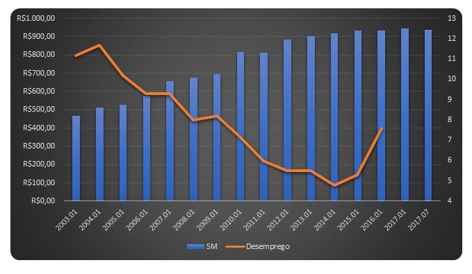 Gráfico: Evolução do salário mínimo real e do desemprego: 2003-2017[iii]