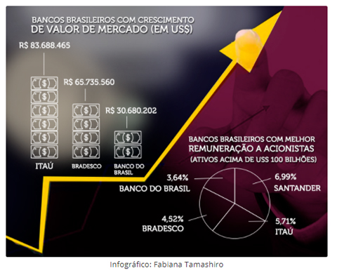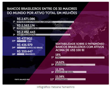 Itaú Unibanco ocupa a 23ª posição entre os 30 maiores do mundo, seguei pelo Banco do Brasil na 24ª colocação e Bradesco na 28ª.