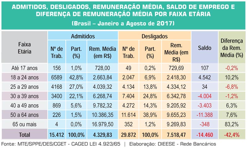 Os bancos fecharam 14.460 postos de trabalho no Brasil, entre janeiro e agosto de 2017, de acordo com o Cadastro Geral de Empregados e Desempregados (Caged), divulgado dia 22/9, pelo Dieese. Em agosto de 2017, registrou-se saldo positivo em 72 postos no setor bancário, após dezessete meses consecutivos de saldos negativos. Porém, em agosto, o Caged registrou o fechamento de 3.780 postos.