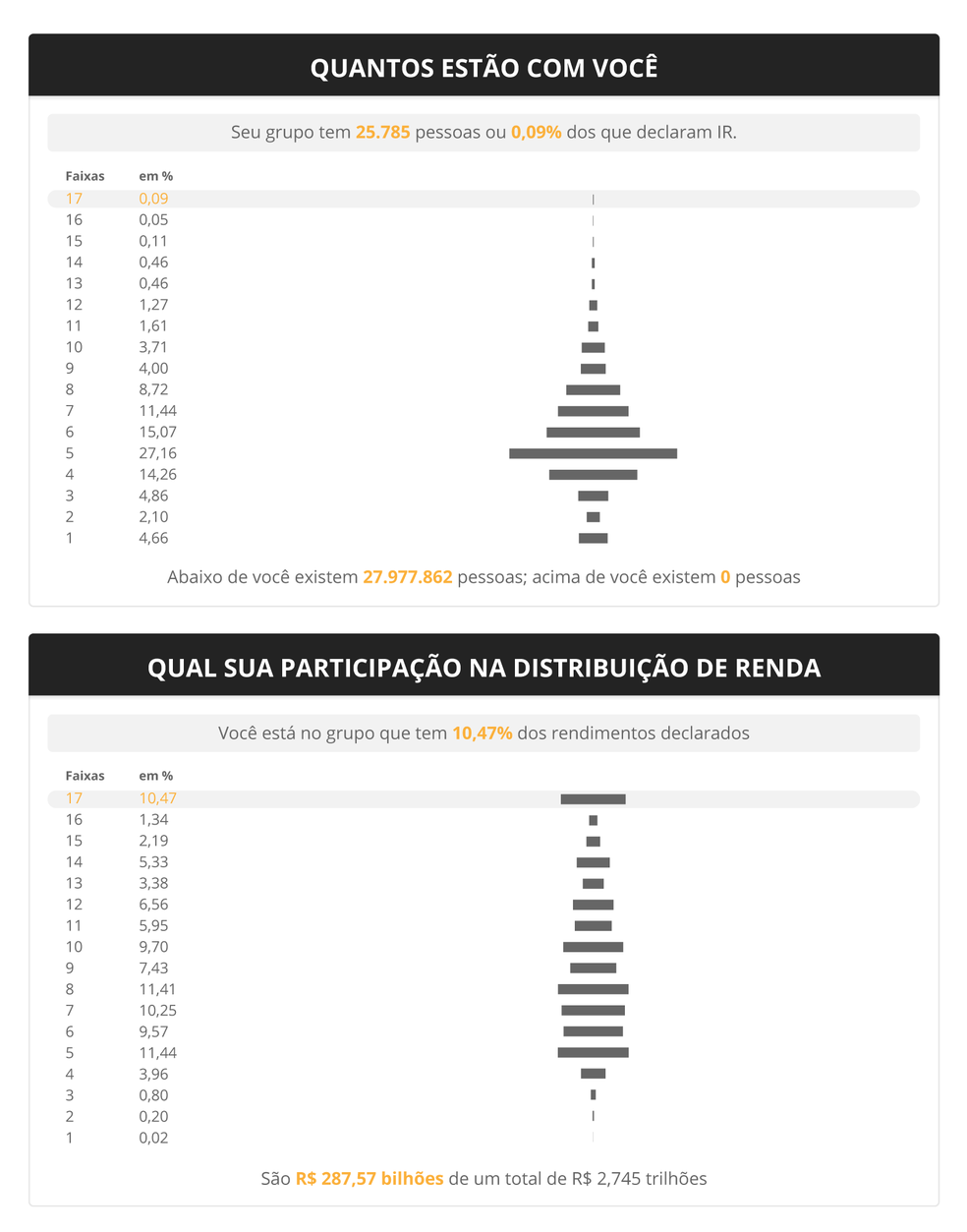 Essa elite de 324 mil brasileiros das últimas 5 faixas do topo da pirâmide recebeu 22,7% de toda a renda declarada ao Fisco em 2017, ao passo que o valor de IR cobrado nessas faixas correspondeu por 16,2% da mordida total do tributo.