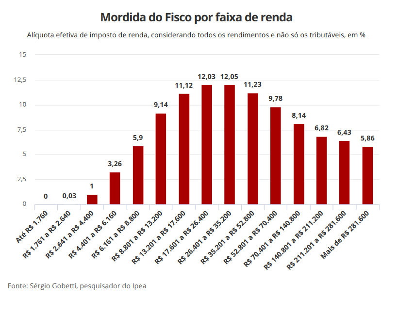 Cálculo feito pelo economista Sergio Gobetti, do Instituto de Pesquisa Econômica Aplicada (Ipea), para o G1, mostra que a alíquota de IR efetivamente paga, considerando todos os rendimentos, inclusive os isentos, cresce somente até a faixa dos brasileiros com renda mensal entre R$ 26.401 a R$ 35.200, quando chega a uma mordida de 12%.