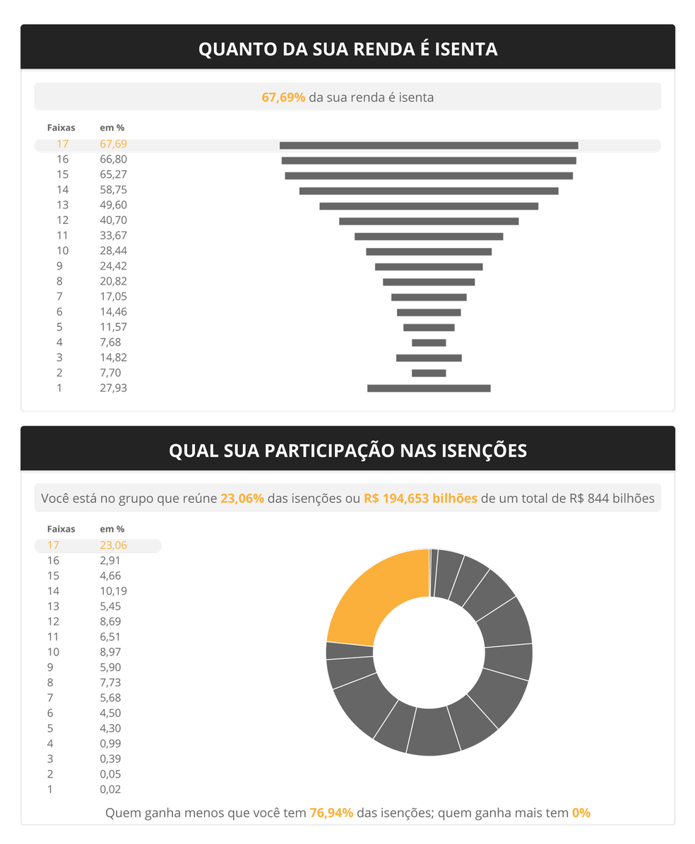 Quanto maior é a renda, maior é a fatia de isenção sobre o rendimento total. No 5º degrau da pirâmide, na faixa com renda mensal entre R$ 2.641 a R$ 4.400, o percentual de renda isenta é 11,57%. A proporção sobe para 40,7% na faixa de renda entre R$ 35.201 a R$ 52.800 e chega a 67,69% no topo da pirâmide, para quem ganha mais de R$ 281.600 mensais.