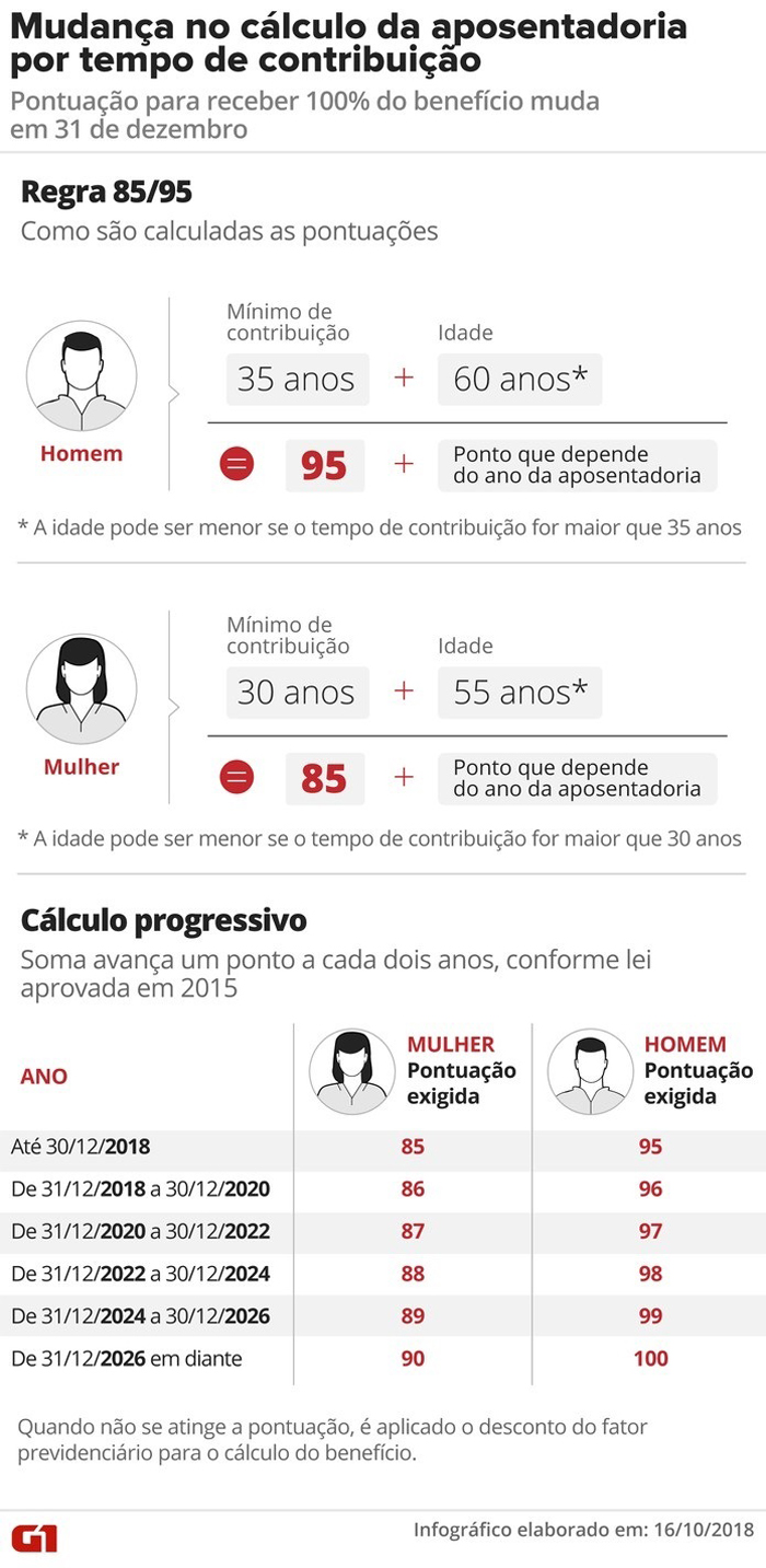 Pela regra atual, da fórmula 85/95, a soma entre a idade e o tempo de contribuição no caso das mulheres deve ser de pelo menos 85 anos e no caso dos homens, de 95 anos, para que o trabalhador ou trabalhadora tenha direito a aposentadoria com o benefício integral. A partir de 2019, essa soma exigida sobe um ponto para ambos, passando a ser de 86, para mulheres, e 96, para homens.