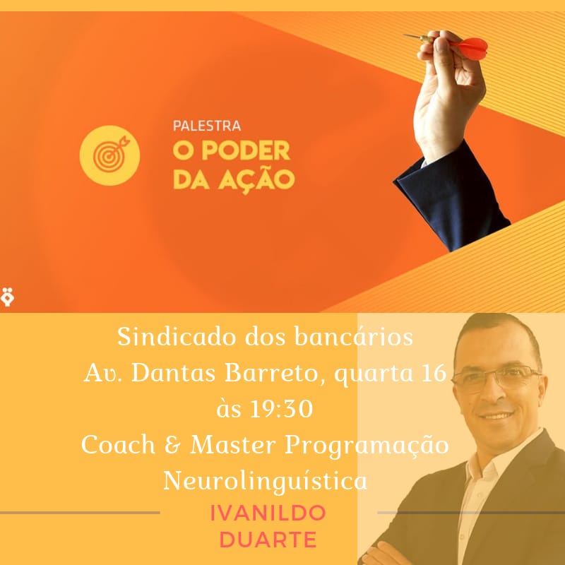 O Seeb Garanhuns e Região convida seus associados para participarem, amanhã dia 24/01 às 19:30, no auditório do sindicato, da palestra “O poder da ação” com o Coach e Master programação Neurolinguística Ivanildo Duarte.