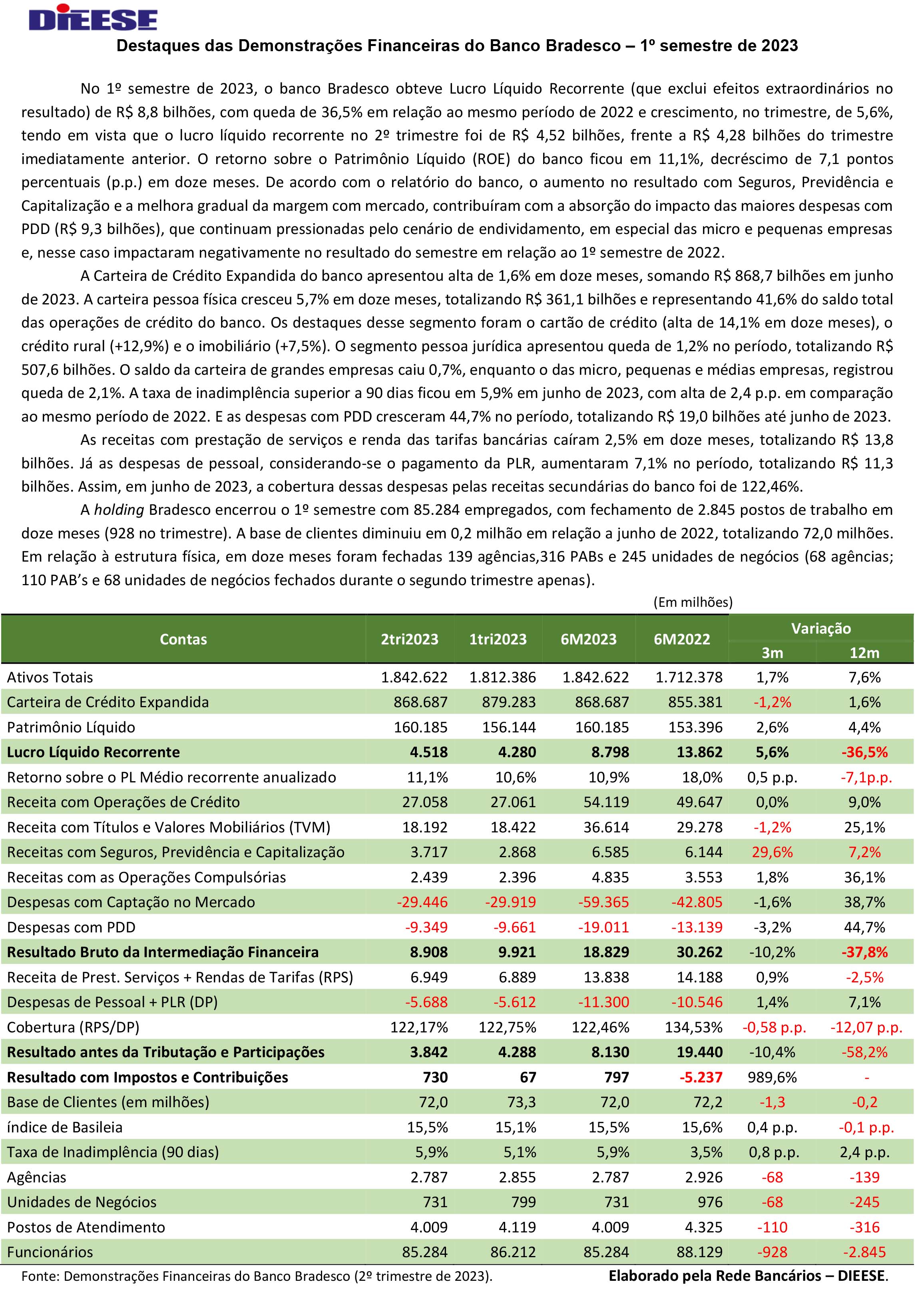 O Bradesco obteve Lucro Líquido Recorrente, que exclui efeitos extraordinários no resultado, de R$ 8,8 bilhões, no 1º semestre de 2023. O resultado representa queda de 36,5% em relação ao mesmo período de 2022. Na comparação trimestral, houve crescimento de 5,6%, já que o lucro líquido recorrente no 2º trimestre foi de R$ 4,52 bilhões, frente a R$ 4,28 bilhões do trimestre anterior.