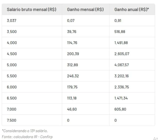 O ganho para quem tem salário de R$ 5 mil será o maior de todos, de R$ 312,89 por mês, equivalente a um adicional de renda de R$ 4.067 no ano, considerando o décimo terceiro salário.
