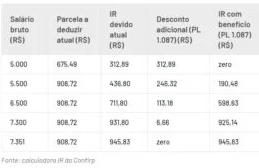 Hoje, pela tabela progressiva vigente, apenas quem ganha até R$ 3.036 está livre do imposto de renda. Com o novo projeto, essa faixa salta para R$ 5 mil por mês (R$ 60 mil ao ano).