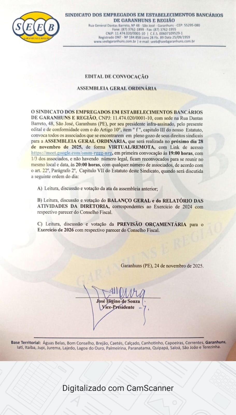 *HORÁRIO:* 19:00H ( 1ª CONVOCAÇÃO) E 20:00H (2ª CONVOCAÇÃO)