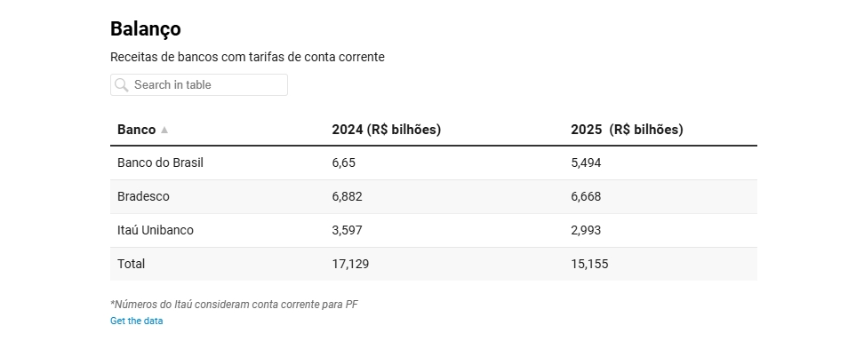 Itaú Unibanco, Bradesco e Banco do Brasil arrecadaram R$ 15,155 bilhões em 2025 com as contas bancárias, queda de 11% em relação a 2024 (Por André Marinho)