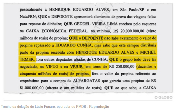 Em delação premiada, o doleiro Lúcio Bolonha Funaro afirmou que o grupo político formado pelo presidente Michel Temer e pelos ex-deputados Eduardo Cunha e Henrique Alves recebeu cerca de R$ 250 milhões em propinas decorrentes de créditos da Caixa Econômica Federal, repassados pelas vice-presidências de Pessoa Jurídica e Fundos de Governo e Loterias.