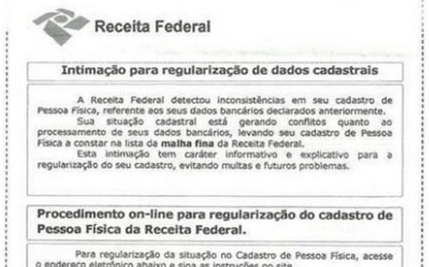 Neste caso, o contribuinte recebe, por correspondência, em sua casa, uma intimação para regularização de dados cadastrais e um endereço eletrônico para acessar uma plataforma de atualização dos dados bancários. O endereço informado não tem nenhuma relação com o site da Receita.