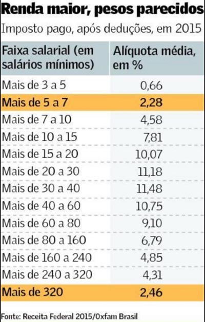 "O que esses dados mostram é que o 1% mais rico paga pouco imposto e é essa discussão que queremos fazer", diz a diretora-executiva da Oxfam Brasil, Katia Maia. O relatório indica que pessoas que ganhavam R$ 252 mil mensais em 2015, ou 320 salários mínimos, pagaram efetivamente em imposto alíquota similar à de quem ganhava R$ 3,9 mil mensais, ou cinco mínimos. "Existe a ideia de que todos pagamos muito imposto no Brasil, e é verdade. Mas quem está pagando essa conta é a classe média e as pessoas mais pobres", afirma.