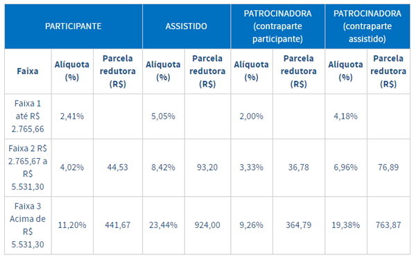 No REG/Replan Não Saldado, as taxas extraordinárias são definidas de acordo com as faixas de salários de participação para os ativos e benefícios efetivos FUNCEF (sem incidência sobre o INSS) para os assistidos (aposentados e pensionistas). Ou seja, são calculadas nos mesmos moldes e critérios das faixas de contribuição atuais, conforme a tabela abaixo.