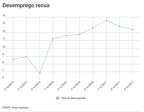 Com 12,9 milhões de desocupados no Brasil, a taxa de desemprego apurada pela Pesquisa Nacional por Amostra de Domicílios Contínua (Pnad Contínua) encerrou o período de julho a setembro de 2017 em 12,4%, segundo o Instituto Nacional de Geografia e Estatística (IBGE). Trata-se de um recuo de 0,6 ponto porcentual em relação ao trimestre de abril a junho (13,0%) e da menor taxa desde o quarto trimestre de 2016, quando estava em 12,0%.