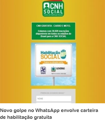 O tempo passa, mas uma coisa não muda: os brasileiros seguem caindo em golpes disseminados via WhatsApp. O alvo da vez de hackers são pessoas que recebem menos de dois salários mínimos ou que estão desempregadas há mais de um ano. Segundo o DFNDR Lab, laboratório de segurança digital, o golpe envolve a CNH social, instituída pelos governos estaduais para pessoas nestas condições.
