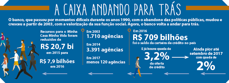 Com a adoção de políticas de austeridade em meio ao desmonte do Estado Nacional, a economia brasileira teve queda do PIB, dos investimentos e do crédito total. A Caixa, por sua vez, anunciou um Plano de Demissão Voluntária (PDV) em 2016, embora o número de funcionários tenha caído antes de sua efetivação: de 95.458 em 2015 para 94.978 em 2016 e também se propôs a fechar cerca de 120 agências em 2017. Mais importantes que esses ajustes foram as políticas que fizeram cair a oferta de crédito livre e direcionado e elevaram os juros da Caixa.
