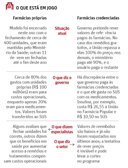 Questionado, o Ministério da Saúde afirma que direcionou todos os R$ 100 milhões antes gastos com as unidades próprias do Farmácia Popular para aumentar a oferta de medicamentos na rede pública.