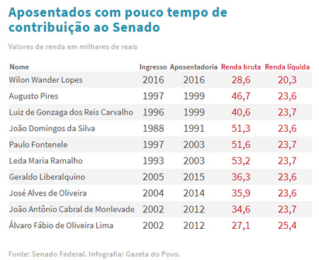 Há ainda casos de servidores que se aposentaram após 15 anos de serviços prestados ao Senado. É o caso de Carlos Vieira da Silva, que tem vencimentos de R$ 37,6 mil brutos; Cristina Pacheco Moreira, com renda de R$ 35,8 mil; e Iara Guimarães Altafin, que recebe R$ 29,7 mil.