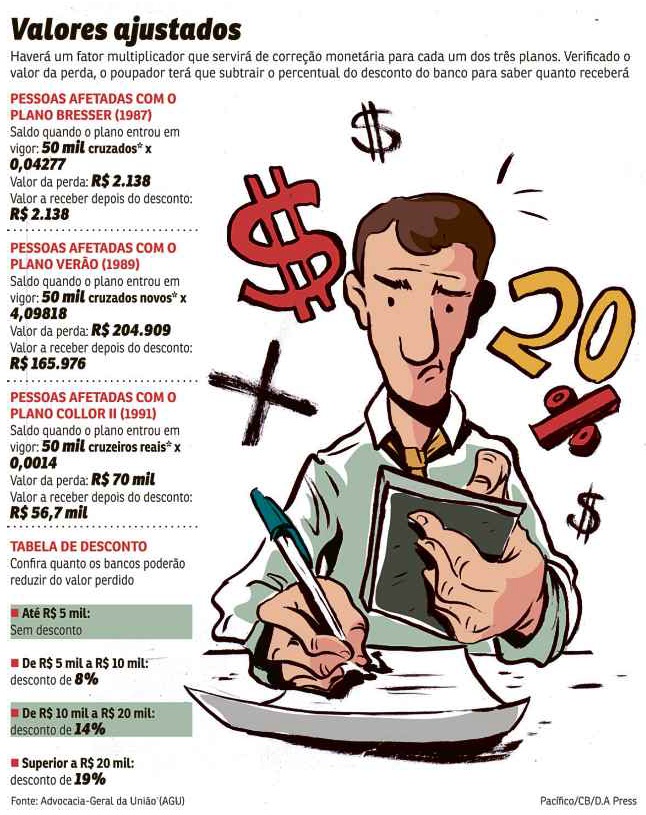 O acordo que foi promulgado na terça-feira estabeleceu um fator multiplicador para a correção monetária, que incidirá no saldo que a pessoa tinha na época. Cada plano terá um número específico. Depois que a pessoa fizer a transformação, precisará ficar atenta ao desconto que o banco fará, conforme o valor, que pode chegar a 19% (Confira o quadro ao lado).