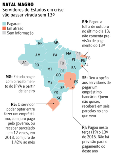 Cerca de 1 milhão e meio de servidores públicos estaduais de cinco Estados não receberão nesta quinta-feira (20) o 13º salário ou terão de recorrer a empréstimos bancários para não ficarem sem o dinheiro no final de ano. Estão nesta situação ao menos Rio de Janeiro, Minas Gerais, Rio Grande do Sul, Rio Grande do Norte e Sergipe.(MARCELO TOLEDO)