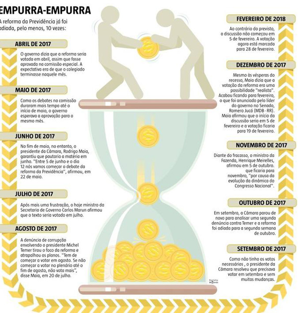 Após 15 meses de discussões e pelo menos 10 adiamentos, aproxima-se o prazo-limite imposto pelo governo para aprovar a reforma da Previdência na Câmara: fim de fevereiro. O projeto – apresentado inicialmente por um governo com base sólida – tinha apoio certo, mas, agora, em ano eleitoral e depois de enfrentar duas denúncias oferecidas pelo Ministério Público Federal (MPF), só os mais otimistas acreditam que os 308 votos serão alcançados.