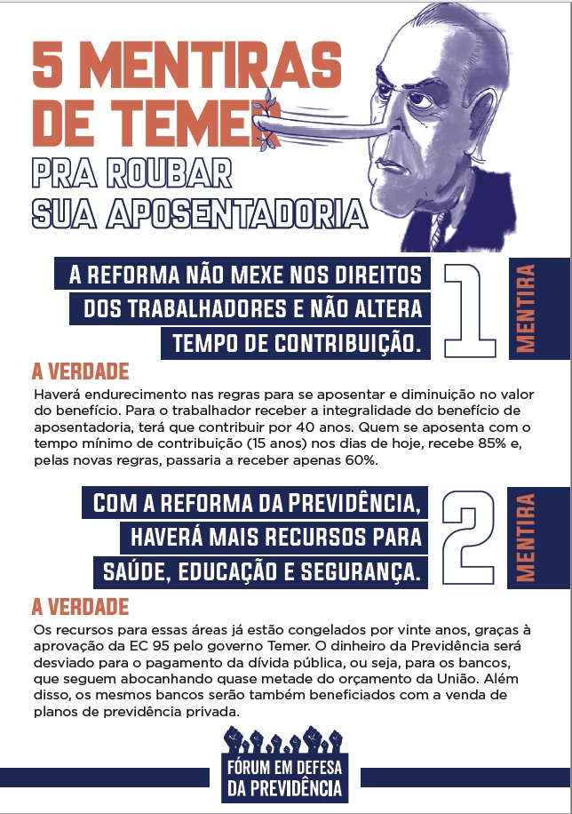 Para convencer o povo brasileiro da necessidade da reforma, Temer mente descaradamente. O Fórum em Defesa da Previdência lança campanha para alertar sobre as mentiras contadas pelo governo ilegítmo de Michel Temer para aprovar a proposta de Reforma da Previdência.