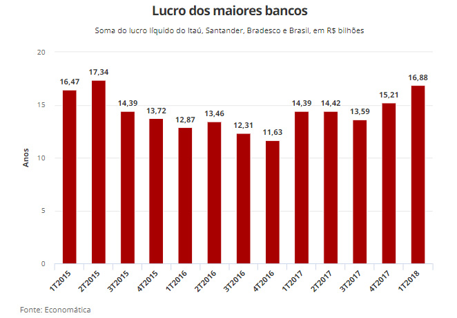 O lucro líquido dos 4 maiores bancos do Brasil com ações na bolsa cresceu 17% no 2º trimestre, na comparação com a mesma etapa do ano passado, e somou R$ 16,88 bilhões. Segundo dados da Economatica, trata-se do maior lucro consolidado nominal (sem considerar a inflação) desde o 2º trimestre de 2015.