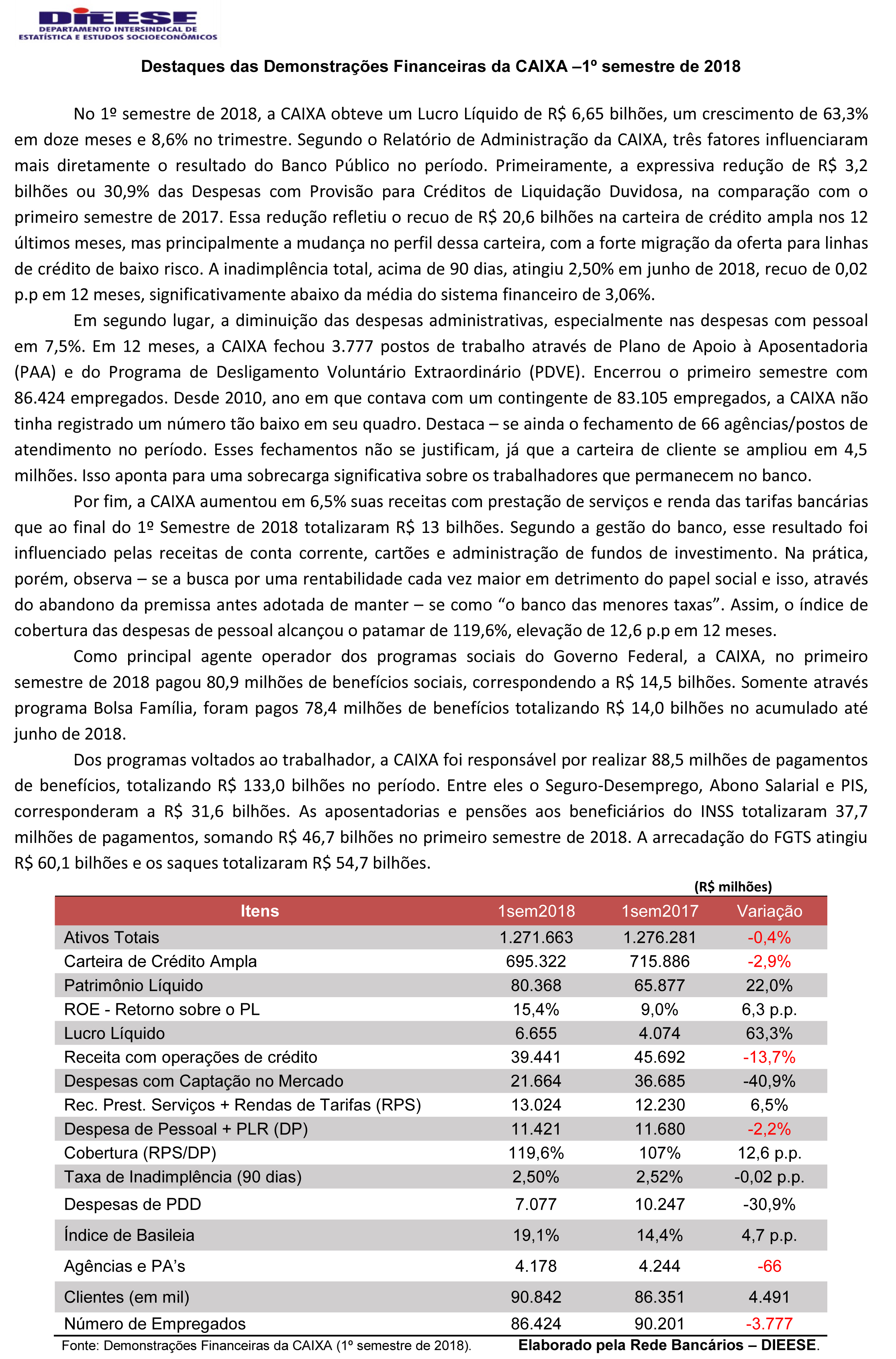 A inadimplência na habitação, no entanto, avançou de 1,64% no segundo trimestre de 2017 para 1,80% neste ano, enquanto a inadimplência no segmento comercial passou de 5,15% para 5,46%. Ao final de junho, a Caixa tinha 90,8 milhões de correntistas e poupadores -88,1 milhões deles de pessoas físicas – e 4,2 mil agências e postos de atendimento. (Fonte: Gazeta do Povo) Veja abaixo a tabela resumo do balanço Caixa e leia íntegra na análise do DIEESE.