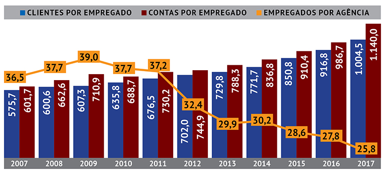 Em dezembro de 2014 a Caixa Econômica Federal tinha 101.484 empregados para atender 78 milhões de clientes. Hoje são 86.427 e esse número deve cair para menos de 85 mil bancários para cuidar de 102,6 milhões de contas.