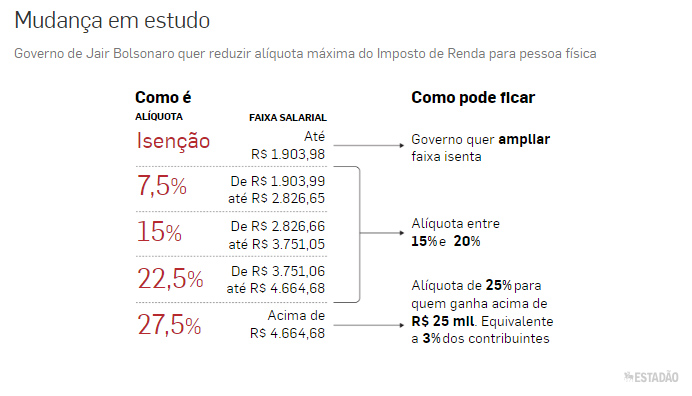 Atualmente, a alíquota de 27,5% é cobrada dos contribuintes que ganham a partir de R$ 4.664,68 por mês. A informação das mudanças no Imposto de Renda foi antecipada pelo jornal O Globo. Bolsonaro, que não deu mais detalhes sobre a mudança no IR, deu uma rápida entrevista na Base Aérea de Brasília após a transmissão de cargo do novo comandante da Aeronáutica.