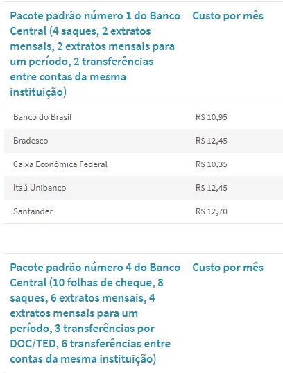 Confira o comparativo, lembrando que cada instituição oferece pacotes diferenciados, além dos padronizados pelo BC, de acordo com o perfil do cliente: