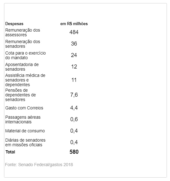 Cada senador custa R$ 596 mil por mês aos cofres públicos. O gasto anual com cada um deles chega a R$ 7 milhões. Considerando as despesas de todos os senadores, são R$ 580 milhões por ano. A maior parte é gasta com assessores que abarrotam os seus gabinetes. Chegaram a ser 2,5 mil na legislatura recém encerrada, sendo 90% deles de livre nomeação. Alguns senadores tiveram mais de 80 assessores.