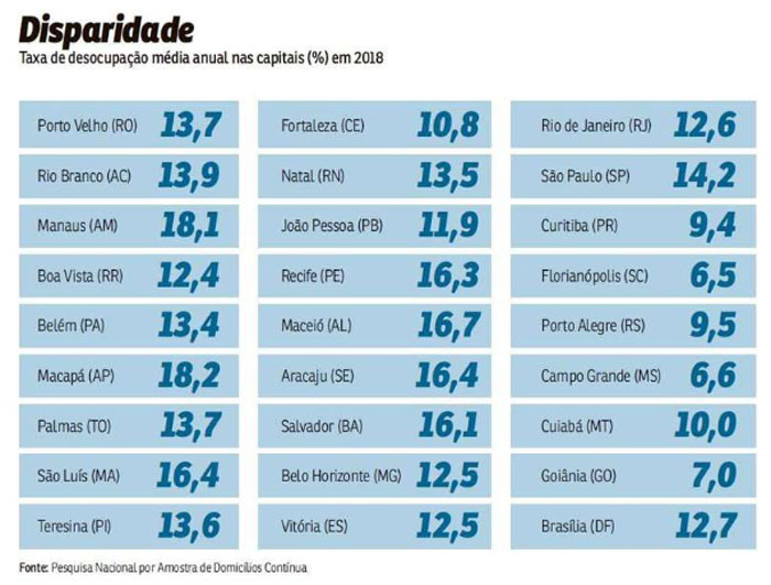 A taxa média de desemprego, em 2018, foi a maior dos últimos sete anos em 13 capitais do país, na contramão da média nacional, que caiu de 12,7%, em 2017, para 12,3% no ano passado. Os dados fazem parte da Pesquisa Nacional por Amostras de Domicílio (Pnad Contínua), divulgada ontem pelo Instituto Brasileiro de Geografia e Estatística (IBGE).