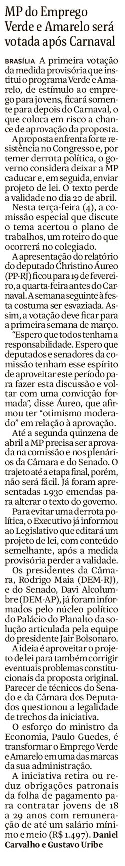 MP do Emprego Verde e Amarelo será votada após Carnaval