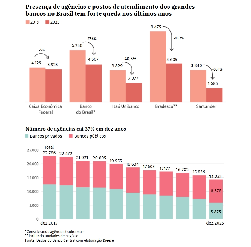 No Ceará, o fechamento está acelerado. Foram encerrados 117 locais desde 2022, aponta o Sindicato dos Bancários do estado. Só em 2025 foram 62.