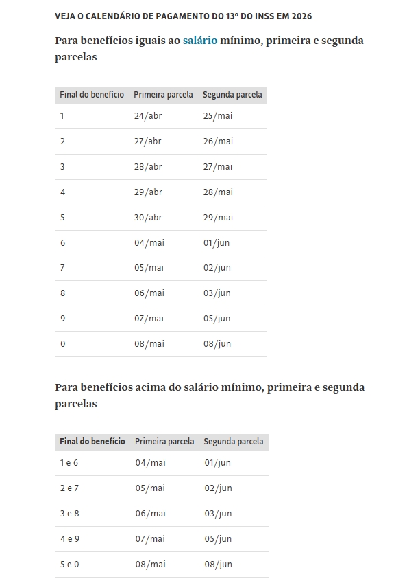 A primeira parcela do 13º para aposentados e pensionistas do INSS (Instituto Nacional do Seguro Social) começa a ser paga nesta sexta-feira (24) e segue até 8 de maio. Os primeiros pagamentos são para beneficiários que recebem o piso e o dinheiro para quem ganha acima do salário mínimo será pago a partir de 4 de maio.